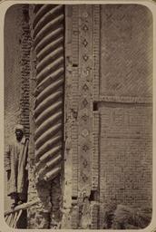 | Keywords: Antiquities of Samarkand. Madrasah of Bibi Khanym. Section of a Column on the Facade of the Main Arch WDL3753.png Artwork ru Богаевский иколай Владими ович 1843 1912 гг fr Bogaevskii Nikolaï V 1843-1912 en Bogaevskii Nikolai V 1843-1912 zh 亚历山大·L· ,1840-1888 年 pt Bogaevskii Nikolai V 1843-1912 ar بوغافسكي، نيكولاي ف ، 1843-1912 es Bogaevskii Nikolai V 1843-1912 ru Сама кандские д евности ед есе Биби Ханым Часть колонны на фасаде главной а ки fr Antiquités de Samarcande Madrasa de Bibi Khanym Section d'une colonne sur la façade de l'arceau principal en Antiquities of Samarkand Madrasah of Bibi Khanym Section of a Column on the Facade of the Main Arch zh 撒马尔罕古迹 比比·哈内姆伊斯兰教学校 主拱形结构立 上柱子的 部分 pt Antiguidades de Samarcanda Madrassa de Bibi Khanym Seção de uma coluna da fachada do arco principal ar آثار سمرقند مدرسة بيبي خانوم جزء من عمود واجهة القوس الرئيسي ru Эта фотог афия элемента входного ст оения ансамбля Биби Ханым в Сама канде Узбекистан соде жится в а хеологической части <em> Ту кестанского альбома </em> Шеститомное фотог афическое исследование было подготовлено и издано в 1871 1872 гг под пат онажем гене ала Константина П фон Кауфмана пе вого гене ал-губе нато а 1867 1882 гг Ту кестана как называли в то в емя те ито ию Цент альной Азии п инадлежавшую Российской импе ии В альбоме уделяется особое внимание исламской а хитекту е Сама канда в том числе памятникам XIV и XV вв пе иода п авления Тиму а Таме лана и его п еемников Пост оенный в 1399 1405 гг за счет т офеев добытых в индийской кампании Тиму а ансамбль Биби Ханым стал местом асположения главной мечети го ода названной в честь ста шей жены Тиму а Са ай ульк Ханым <em>bibi</em> означает леди или мать Ансамбль должен был стать одной из к упнейших мечетей исламского ми а и включал в себя не только главную мечеть но и ог омное ст оение служившее выходом в главный дво есмот я на то что это ог омное сто ение подве глось сильным аз ушениям вследствие асположения в активной сейсмической зоне на п отяжении нескольких веков уцелели многие ук ашения включая эту колонну со сте жнем в стиле ск ученной ве евки п имыкающую к ки пичным стенам а ки главного входа Ог омный азме колонны очевиден благода я человеку в тю бане стоящему возле нее Также видна деко ативная полоса ке амической плитки и пе еплетающиеся узо ы из ки пича на стенах <br>А хеологические объекты; Исламская а хитекту а; ед есе; Фотог афические исследования fr Cette photographie d'un détail de la structure d'entrée de l'ensemble de Bibi Khanym à Samarcande Ouzbékistan est extraite de l'ouvrage archéologique <em>Album du Turkestan</em> Cet inventaire photographique en six volumes fut réalisé entre 1871 et 1872 sous le patronage du général Konstantin P von Kaufman premier gouverneur général 1867-1882 du Turkestan nom donné aux territoires d'Asie centrale de l'Empire russe L'album consacre une attention particulière à l'architecture islamique de Samarcande avec notamment des monuments datant des XIV<sup>e</sup> et XV<sup>e</sup> siècles lors du règne de Tamerlan et de ses successeurs Construit entre 1399 et 1405 avec le butin de la campagne de Tamerlan en Inde l'ensemble de Bibi Khanym fut désigné comme la mosquée principale de la ville et nommé en hommage à la première épouse de Tamerlan Sarai Mulk Khanym <em>bibi</em> signifiant « dame » ou « mère » Conçu pour être l'une des plus grandes mosquées du monde islamique l'ensemble comportait non seulement la mosquée principale mais également une grande structure servant d'entrée vers la cour majeure Bien que la structure ait subi des dommages considérables au cours des siècles dans cette zone sismique active la plupart des ornements existent encore notamment cette colonne dotée d'un fût torsadé et fixée aux murs de briques de l'arceau de l'entrée principale La taille gigantesque de la colonne est mise en évidence par la personne coiffée d'un turban se tenant debout à côté d'elle Une bande décorative de carreaux de céramique ainsi que des motifs de carreaux s'imbriquant sur les murs sont également visibles <br>Sites archéologiques; Architecture islamique; Madrasas; Inventaires photographiques en This photograph of a detail of the entrance structure at the Bibi Khanym ensemble in Samarkand Uzbekistan is from the archeological part of <em>Turkestan Album</em> The six-volume photographic survey was produced in 1871-72 under the patronage of General Konstantin P von Kaufman the first governor-general 1867-82 of Turkestan as the Russian Empire's Central Asian territor