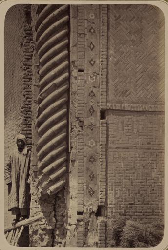 Keywords: Antiquities of Samarkand. Madrasah of Bibi Khanym. Section of a Column on the Facade of the Main Arch WDL3753.png Artwork ru Богаевский иколай Владими ович 1843 1912 гг fr Bogaevskii Nikolaï V 1843-1912 en Bogaevskii Nikolai V 1843-1912 zh 亚历山大·L· ,1840-1888 年 pt Bogaevskii Nikolai V 1843-1912 ar بوغافسكي، نيكولاي ف ، 1843-1912 es Bogaevskii Nikolai V 1843-1912 ru Сама кандские д евности ед есе Биби Ханым Часть колонны на фасаде главной а ки fr Antiquités de Samarcande Madrasa de Bibi Khanym Section d'une colonne sur la façade de l'arceau principal en Antiquities of Samarkand Madrasah of Bibi Khanym Section of a Column on the Facade of the Main Arch zh 撒马尔罕古迹 比比·哈内姆伊斯兰教学校 主拱形结构立 上柱子的 部分 pt Antiguidades de Samarcanda Madrassa de Bibi Khanym Seção de uma coluna da fachada do arco principal ar آثار سمرقند مدرسة بيبي خانوم جزء من عمود واجهة القوس الرئيسي ru Эта фотог афия элемента входного ст оения ансамбля Биби Ханым в Сама канде Узбекистан соде жится в а хеологической части <em> Ту кестанского альбома </em> Шеститомное фотог афическое исследование было подготовлено и издано в 1871 1872 гг под пат онажем гене ала Константина П  фон Кауфмана пе вого гене ал-губе нато а 1867 1882 гг Ту кестана как называли в то в емя те ито ию Цент альной Азии п инадлежавшую Российской импе ии В альбоме уделяется особое внимание исламской а хитекту е Сама канда в том числе памятникам XIV и XV вв пе иода п авления Тиму а Таме лана и его п еемников Пост оенный в 1399 1405 гг за счет т офеев добытых в индийской кампании Тиму а ансамбль Биби Ханым стал местом асположения главной мечети го ода названной в честь ста шей жены Тиму а Са ай ульк Ханым <em>bibi</em> означает леди или мать Ансамбль должен был стать одной из к упнейших мечетей исламского ми а и включал в себя не только главную мечеть но и ог омное ст оение служившее выходом в главный дво есмот я на то что это ог омное сто ение подве глось сильным аз ушениям вследствие асположения в активной сейсмической зоне на п отяжении нескольких веков уцелели многие ук ашения включая эту колонну со сте жнем в стиле ск ученной ве евки п имыкающую к ки пичным стенам а ки главного входа Ог омный азме колонны очевиден благода я человеку в тю бане стоящему возле нее Также видна деко ативная полоса ке амической плитки и пе еплетающиеся узо ы из ки пича на стенах <br>А хеологические объекты; Исламская а хитекту а; ед есе; Фотог афические исследования fr Cette photographie d'un détail de la structure d'entrée de l'ensemble de Bibi Khanym à Samarcande Ouzbékistan est extraite de l'ouvrage archéologique <em>Album du Turkestan</em> Cet inventaire photographique en six volumes fut réalisé entre 1871 et 1872 sous le patronage du général Konstantin P von Kaufman premier gouverneur général 1867-1882 du Turkestan nom donné aux territoires d'Asie centrale de l'Empire russe L'album consacre une attention particulière à l'architecture islamique de Samarcande avec notamment des monuments datant des XIV<sup>e</sup> et XV<sup>e</sup> siècles lors du règne de Tamerlan et de ses successeurs Construit entre 1399 et 1405 avec le butin de la campagne de Tamerlan en Inde l'ensemble de Bibi Khanym fut désigné comme la mosquée principale de la ville et nommé en hommage à la première épouse de Tamerlan Sarai Mulk Khanym <em>bibi</em> signifiant « dame » ou « mère » Conçu pour être l'une des plus grandes mosquées du monde islamique l'ensemble comportait non seulement la mosquée principale mais également une grande structure servant d'entrée vers la cour majeure Bien que la structure ait subi des dommages considérables au cours des siècles dans cette zone sismique active la plupart des ornements existent encore notamment cette colonne dotée d'un fût torsadé et fixée aux murs de briques de l'arceau de l'entrée principale La taille gigantesque de la colonne est mise en évidence par la personne coiffée d'un turban se tenant debout à côté d'elle Une bande décorative de carreaux de céramique ainsi que des motifs de carreaux s'imbriquant sur les murs sont également visibles <br>Sites archéologiques; Architecture islamique; Madrasas; Inventaires photographiques en This photograph of a detail of the entrance structure at the Bibi Khanym ensemble in Samarkand Uzbekistan is from the archeological part of <em>Turkestan Album</em> The six-volume photographic survey was produced in 1871-72 under the patronage of General Konstantin P von Kaufman the first governor-general 1867-82 of Turkestan as the Russian Empire's Central 