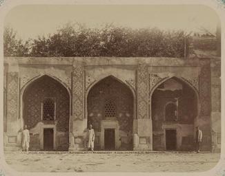 | Keywords: Antiquities of Samarkand. Madrasah of Nadir Divan-Begi. Inner Door. View of One-Storied Cells Surrounding the Inner Courtyard WDL3792.png Artwork ru Богаевский иколай Владими ович 1843 1912 гг fr Bogaevskii Nikolaï V 1843-1912 en Bogaevskii Nikolai V 1843-1912 zh 亚历山大·L· ,1840-1888 年 pt Bogaevskii Nikolai V 1843-1912 ar بوغافسكي، نيكولاي ف ، 1843-1912 es Bogaevskii Nikolai V 1843-1912 ru Сама кандские д евности ед есе ади Диван-Беги Внут енняя две ь Вид на одноэтажные кельи ок ужающие внут енний дво fr Antiquités de Samarcande Madrasa de Nadir Divan-Begi Porte intérieure Vue des modules à un étage entourant la cour intérieure en Antiquities of Samarkand Madrasah of Nadir Divan-Begi Inner Door View of One-Storied Cells Surrounding the Inner Courtyard zh 撒马尔罕古迹 纳迪尔·迪万- 吉伊斯兰教学校 内门 内部庭院周围的 层高小室 pt Antiguidades de Samarcanda Madrassa de Nadir Divan-Begi Porta interna Imagem das celas térreas em torno do pátio interno ar آثار سمرقند مدرسة نذير ديفان بيغي الباب الداخلي منظر للوحدات أحادية الطابق المحيطة بالفناء الداخلي ru Эта фотог афия мед есе ади Диван-Беги в Сама канде Узбекистан соде жится в а хеологической части <em> Ту кестанского альбома </em> Шеститомное фотог афическое исследование было подготовлено и издано в 1871 1872 гг под пат онажем гене ала Константина П фон Кауфмана пе вого гене ал-губе нато а 1867 1882 гг Ту кестана как называли в то в емя те ито ию Цент альной Азии п инадлежавшую Российской импе ии В альбоме уделяется особое внимание исламскому а хитекту ному наследию Сама канда Эта <em>мед есе</em> елигиозная школа асположенная ядом с усыпальницей Ходжа Ах а была пост оена в 1631 г ади ом Диван-Беги визи ем буха ского п авителя Имам-Кули Хана ед есе была заплани ована в виде п ямоугольного дво а ок уженного одноэтажной к ытой гале еей для ученых и мечетью с одной сто оны а этом снимке видны т и комнаты <em>худж ы</em> по левой сто оне южной гале еи В каждой сводчатой комнате асположено ешетчатое окно над низкой две ью Стоящие фигу ы людей дают п едставление о масштабе Хотя на фасаде видны значительные пов еждения ке амического о намента очевидно что ниши а ок как и внешний фасад были богато ук ашены многоцветными плитками с цветочными и геомет ическими узо ами ижняя часть стены изначально была пок ыта камнем Ки пичный п оход п иподнимает гале ею над вымощенным камнями дво ом С п авого к ая виден к ай а ки айвана в цент е южной гале еи <br>Исламская а хитекту а; ед есе; Фотог афические исследования fr Cette photographie de la madrasa de Nadir Divan-Begi à Samarcande Ouzbékistan est extraite de l'ouvrage archéologique <em>Album du Turkestan</em> Cet inventaire photographique en six volumes fut réalisé entre 1871 et 1872 sous le patronage du général Konstantin P von Kaufman premier gouverneur général 1867-1882 du Turkestan nom donné aux territoires d'Asie centrale de l'Empire russe L'album consacre une attention particulière à l'héritage de l'architecture islamique de Samarcande Jouxtant le sanctuaire de Khodzha Akhrar cette <em>madrasa</em> école religieuse fut achevée en 1631 sous Nadir Divan-Begi vizir du souverain de Boukhara Imam-Quli Khan Elle fut conçue comme une cour rectangulaire entourée d'un cloître en arcade à un étage pour les érudits avec une mosquée à une extrémité Cette vue présente trois modules <em>khujras</em> sur le côté gauche du cloître sud Chaque module en arche comporte une fenêtre en croisillons au-dessus d'une porte basse Les personnes se tenant debout donnent une idée de l'échelle Bien que la majeure partie des ornements en céramique de la façade aient disparu il est évident que les niches voûtées et la façade extérieure étaient richement décorées de carreaux polychromes avec des motifs géométriques et à fleurs La partie inférieure du mur était à l'origine recouverte de pierre Un passage constitué de briques surélève l'arcade au-dessus de la cour pavée Le bord de l'arceau de l'aivan au centre du cloître sud est visible complètement à droite <br>Architecture islamique; Madrasas; Inventaires photographiques en This photograph of the Nadir Divan-Begi Madrasah in Samarkand Uzbekistan is from the archeological part of <em>Turkestan Album</em> The six-volume photographic survey was produced in 1871-72 under the patronage of General Konstantin P von Kaufman the first governor-general 1867-82 of Turkestan as the Russian Empire s Central Asian territories were called The album devotes special attention to Samarkand s Islamic architectural heritage Located next to the Khodzha Akhrar shrine this <em>madrasah