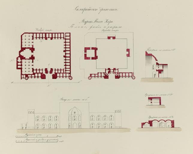 View Original:Antiquities_of_Samarkand._Madrasah_of_Tillia_Kari._Plan,_Elevation,_and_Sections_WDL3584.png (1288x1024)