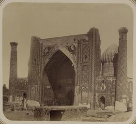 | Keywords: Antiquities of Samarkand. Shir Dar Madrasah. Built by Yalanktush Bagadur, Vezir to Imam-Quli Khan in 1648 (1058 Hegira). View of the Main Facade (Western Side) WDL3793.png Artwork ru Богаевский иколай Владими ович 1843 1912 гг fr Bogaevskii Nikolaï V 1843-1912 en Bogaevskii Nikolai V 1843-1912 zh 亚历山大·L· ,1840-1888 年 pt Bogaevskii Nikolai V 1843-1912 ar بوغافسكي، نيكولاي ف ، 1843-1912 es Bogaevskii Nikolai V 1843-1912 ru Сама кандские д евности ед есе Ши -До Пост оена Яланктушем Багаду ом визи ем Имам-Кули Хана в 1648 г 1058 г хидж ы Вид главного фасада западная сто она fr Antiquités de Samarcande Madrasa de Shir Dar Construite par Yalanktush Bagadur vizir d'Imam-Quli Khan en 1648 1058 de l'hégire Vue de la façade principale côté ouest en Antiquities of Samarkand Shir Dar Madrasah Built by Yalanktush Bagadur Vezir to Imam-Quli Khan in 1648 1058 Hegira View of the Main Facade Western Side zh 撒马尔罕古迹 尔·达伊斯兰教学校 由伊玛尼-屈力汗的维齐儿(译注:伊斯兰教国家高官)亚兰克图 ·巴加 尔 1648 年 伊斯兰历 1058 年)建 主立 (西侧)景观 pt Antiguidades de Samarcanda Madrassa Shir Dar Construído por Yalanktush Bagadur vizir de Imam-Quli Khan em 1648 hégira 1058 Imagem da fachada principal lado ocidental ar آثار سمرقند مدرسة شيردور بناها يالانكتوش بغادور، وزير إمام قولي خان في 1648 1058 هجرياً منظر للواجهة الرئيسة الجهة الغربية ru Эта фотог афия мед есе Ши -До в Сама канде Узбекистан соде жится в а хеологической части <em> Ту кестанского альбома </em> Шеститомное фотог афическое исследование было п оведено в 1871 1872 гг под уководством гене ала Константина П фон Кауфмана пе вого гене ал-губе нато а 1867 1882 гг Ту кестана как называли те ито ию Цент альной Азии п инадлежавшую Российской импе ии В альбоме уделяется особое внимание исламской а хитекту е Сама канда в том числе памятникам XIV и XV вв пе иода п авления Тиму а Таме лана и его п еемников В цент е Сама канда находится ансамбль Регистан объединяющий в себе т и основных об азца <em>madrasah</em> мед есе елигиозных школ Вто ая мед есе в ансамбле Ши -До была пост оена в 1619 1636 гг во в емена буха ской династии Ашта ханидов Здесь показан главный фасад в цент е кото ого находится <em>iwan</em> сводчатый зал с одним отк ытым концом ок уженный с т ех сто он стенами являющийся одним из самых к асивых фасадов в Цент альной Азии азвание означает место обитания львов указывая на двух сви епых хищных зве ей по обе сто оны а ки Они кажется напоминают тиг ов а спине каждого зве я изоб ажено человекоподобное лицо воплощающее дух ге альдического зве я По сто онам фасада асположены два мина ета также пок ытые ке амической отделкой В углах возле мина етов находятся еб истые купола возвышающиеся над учебными залами Хотя асположенная в активной сейсмической зоне мед есе Ши -До п ете пела уще б ст оение относительно хо ошо сох анилось <br>Исламская а хитекту а; ед есе; Фотог афические исследования fr Cette photographie de la madrasa de Shir Dar à Samarcande Ouzbékistan est extraite de l'ouvrage archéologique <em>Album du Turkestan</em> Cet inventaire photographique en six volumes fut réalisé entre 1871 et 1872 sous le patronage du général Konstantin P von Kaufman premier gouverneur général 1867-1882 du Turkestan nom donné aux territoires d'Asie centrale de l'Empire russe L'album consacre une attention particulière à l'architecture islamique de Samarcande avec notamment des monuments datant des XIV<sup>e</sup> et XV<sup>e</sup> siècles lors du règne de Tamerlan et de ses successeurs Situé au centre de Samarcande l'ensemble du Registan est composé de trois exemples majeurs de <em>madrasa</em> école religieuse La deuxième madrasa de l'ensemble celle de Shir Dar fut construite entre 1619 et 1636 au cours de la dynastie astrakane de Bukhara La façade principale est présentée ici avec au centre l'<em>aivan</em> salle voûtée dotée de trois murs et d'un côté ouvert affichant l'une des façades les plus spectaculaires d'Asie centrale Le nom de la madrasa signifie « habitat des lions » et fait référence aux deux fauves rampants des deux côtés de l'arceau Il semble qu'il s'agisse de tigres Au dos de chacun des fauves un visage humanoïde représentant l'esprit de la bête héraldique apparaît La façade est encadrée de deux minarets également recouverts de décoration en céramique Dans les angles près des minarets des dômes striés émergent au-dessus des salles d'enseignement Malgré les dommages dus à l'activité sismique de cette 