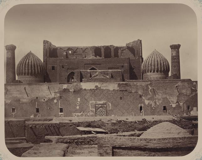 Keywords: Antiquities of Samarkand. Shir Dar Madrasah. View of the Madrasah from the East WDL3795.png Artwork ru Богаевский иколай Владими ович 1843 1912 гг fr Bogaevskii Nikolaï V 1843-1912 en Bogaevskii Nikolai V 1843-1912 zh 亚历山大·L· ,1840-1888 年 pt Bogaevskii Nikolai V 1843-1912 ar بوغافسكي، نيكولاي ف ، 1843-1912 es Bogaevskii Nikolai V 1843-1912 ru Сама кандские д евности ед есе Ши -До Вид на мед есе с востока fr Antiquités de Samarcande Madrasa de Shir Dar Vue de la madrasa de l'est en Antiquities of Samarkand Shir Dar Madrasah View of the Madrasah from the East zh 撒马尔罕古迹 尔·达伊斯兰教学校 伊斯兰教学校 景观 pt Antiguidades de Samarcanda Madrassa Shir Dar Imagem leste da madrassa ar آثار سمرقند مدرسة شيردور منظر للمدرسة من الشرق ru Эта фотог афия мед есе Ши -До в Сама канде Узбекистан соде жится в а хеологической части <em> Ту кестанского альбома </em> Шеститомное фотог афическое исследование было п оведено в 1871 1872 гг под уководством гене ала Константина П фон Кауфмана пе вого гене ал-губе нато а 1867 1882 гг Ту кестана как называли те ито ию Цент альной Азии п инадлежавшую Российской импе ии В альбоме уделяется особое внимание исламской а хитекту е Сама канда в том числе памятникам XIV и XV вв пе иода п авления Тиму а Таме лана и его п еемников В цент е Сама канда находится ансамбль Регистан объединяющий в себе т и основных об азца <em>madrasah</em> мед есе елигиозных школ Вто ое мед есе в ансамбле Ши -До было пост оено в 1619 1636 гг во в емена буха ской династии Ашта ханидов а этом снимке со сто оны востока показана восточная стена четы ехугольного дво а в цент е кото ого находится мечеть отмеченная ешетчатым окном Хотя ст оение асположенное в активной сейсмической зоне относительно хо ошо сох анилось слой ке амической плитки на восточной стене п ете пел значительный уще б Ук ашения стен состоят из пе есекающихся геомет ических фигу с надписями выполненными куфическим письмом таких как ухаммед п о ок Аллаха а заднем плане находятся задняя часть массивной ст укту ы <em>iwan</em> сводчатый зал с одним отк ытым концом ок уженный с т ех сто он стенами с еб истыми куполами над залами по обеим сто онам и мина еты а пе еднем плане асположены ки пичные дома с плоскими к ышами подде живаемыми де евянными балками <br>Исламская а хитекту а; ед есе; Фотог афические исследования fr Cette photographie de la madrasa de Shir Dar à Samarcande Ouzbékistan est extraite de l'ouvrage archéologique <em>Album du Turkestan</em> Cet inventaire photographique en six volumes fut réalisé entre 1871 et 1872 sous le patronage du général Konstantin P von Kaufman premier gouverneur général 1867-1882 du Turkestan nom donné aux territoires d'Asie centrale de l'Empire russe L'album consacre une attention particulière à l'architecture islamique de Samarcande avec notamment des monuments datant des XIV<sup>e</sup> et XV<sup>e</sup> siècles lors du règne de Tamerlan et de ses successeurs Situé au centre de Samarcande l'ensemble du Registan est composé de trois exemples majeurs de <em>madrasa</em> école religieuse La deuxième madrasa de l'ensemble celle de Shir Dar fut construite entre 1619 et 1636 au cours de la dynastie astrakane de Bukhara Cette vue présente le mur est de la cour carrée avec au centre une mosquée dont on aperçoit une fenêtre en croisillons Bien que la structure ait été relativement bien conservée dans cette région d'activité sismique la couche de carreaux de céramique du mur est présente des pertes considérables Le mur est décoré de figures géométriques s'entrecroisant et d'inscriptions en écriture kufique angulaire telles que « Mahomet prophète d'Allah » Le second plan est occupé par l'arrière de la structure massive de l'<em>aivan</em> salle voûtée dotée de trois murs et d'un côté ouvert encadré des deux côtés par des dômes striés au-dessus des salles d'enseignement ainsi que les minarets Des maisons de briques dont les toits plats sont soutenus par des poutres en bois apparaissent au premier plan <br>Architecture islamique; Madrasas; Inventaires photographiques en This photograph of the Shir Dar Madrasah in Samarkand Uzbekistan is from the archeological part of <em>Turkestan Album</em> The six-volume photographic survey was produced in 1871-72 under the patronage of General Konstantin P von Kaufman the first governor-general 1867-82 of Turkestan as the Russian Empire s Central Asian territories were called The album devotes special attention to Samarkand s Islamic architecture such as 14th- and 15th-century monuments from the reign of Timur Tamerlane and his successors In th
