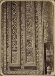 | Keywords: Antiquities of Samarkand. Tomb of the Saint Kusam-ibn-Abbas (Shah-i Zindah) and Adjacent Mausoleums. Mausoleum of Emir Kutuluk Turdi Bek Aka. Inscription on the Right Side of the Facade (Bottom) WDL3655.png Artwork ru Богаевский иколай Владими ович 1843 1912 гг fr Bogaevskii Nikolaï V 1843-1912 en Bogaevskii Nikolai V 1843-1912 zh 亚历山大·L· ,1840-1888 年 pt Bogaevskii Nikolai V 1843-1912 ar بوغافسكي، نيكولاي ف ، 1843-1912 es Bogaevskii Nikolai V 1843-1912 ru Сама кандские д евности Г обница святого Куссама ибн Абасса Шах-Зиндэ и мавзолеи п и ней авзолей эми а Кутулука Ту ди Бека Ака адпись на п авой сто оне фасада низ fr Antiquités de Samarcande Sépulcre de Kusam-ibn-Abbas Shah-i Zindah et mausolées adjacents Mausolée de l'émir Kutuluk Turdi Bek Aka Inscription sur le côté droit de la façade partie inférieure en Antiquities of Samarkand Tomb of the Saint Kusam-ibn-Abbas Shah-i Zindah and Adjacent Mausoleums Mausoleum of Emir Kutuluk Turdi Bek Aka Inscription on the Right Side of the Facade Bottom zh 撒马尔罕古迹 库萨姆-伊 -阿巴斯之墓(夏伊辛达)及其邻近陵墓 埃米尔库图卢克·吐尔迪· 克·阿卡的陵墓 立 右侧的铭文(底部) pt Antiguidades de Samarcanda Túmulo do Santo Kusam-ibn-Abbas Shakhi Zinda e mausoléus adjacentes Mausoléu do Emir Kutuluk Turdi Bek Aka Inscrição no lado direito da fachada parte inferior ar آثار سمرقند ضَرِيح الوَلِيّ قثم بن عباس شاه زنده والأضرحة المجاورة ضريح الأمير كُتُلغ تُرْدِى بَكْ-أغا نقش على الجانب الأيمن للواجهة الجزء السفلي ru Эта фотог афия главного фасада мавзолея Шади- ульк в нек ополе Шах-Зиндэ в Сама канде соде жится в а хеологической части <em> Ту кестанского альбома </em> Шеститомное фотог афическое исследование было подготовлено и издано в 1871 1872 гг под пат онажем гене ала Константина П фон Кауфмана пе вого гене ал-губе нато а 1867 1882 гг Ту кестана как называли в то в емя те ито ию Цент альной Азии п инадлежавшую Российской импе ии Основными составителями фотомате иалов стали п икоманди ованный к а мии востоковед Александ Людвигович Кун и военный инжене иколай Владими ович Богаевский Они уделяли особое внимание исламской а хитекту е Сама канда в том числе памятникам XIV и XV вв пе иода п авления Таме лана и его п еемников Шах-Зиндэ на пе сидском языке означает живой ца ь почитается как мемо иал Куссама ибн Абасса двою одного б ата п о ока ухаммада авзолей Шади- ульк-Ака был пост оен в 1372 г для пог ебения Улджай Шади- ульк доче и ста шей сест ы Таме лана Кутлуг-Ту кан-Ака а фотог афии п авой сто оны фасада видна се ия ке амических ук ашений в виде ве тикальных полос в том числе многоцветная плитка майолика и озетки фаянсовая мозаика и узо чатое а абское письмо в укописном стиле сулюс Все это находится между езными колоннами из те акоты начиная с тех что об амляют главную а ку слева и до колонн большего азме а по углам ст оения сп ава <br>А хитекту ные ук ашения и деко ативные элементы; Исламская а хитекту а; Фотог афические исследования; огильные памятники; Шах-Зиндэ; Г обницы fr Cette photographie de la façade principale du mausolée de Shadi Mulk situé dans la nécropole de Shah-i Zindah à Samarcande est extraite de l'ouvrage archéologique <em>Album du Turkestan</em> Cet inventaire photographique en six volumes fut réalisé entre 1871 et 1872 sous le patronage du général Konstantin P von Kaufman premier gouverneur général 1867-1882 du Turkestan nom donné aux territoires d'Asie centrale de l'Empire russe Les documents visuels furent essentiellement compilés par Aleksandr L Kun orientaliste rattaché à l'armée et Nikolai V Bogaevskii ingénieur militaire Ces derniers consacrèrent une attention particulière à l'architecture islamique de Samarcande avec notamment des monuments datant des XIV<sup>e</sup> et XV<sup>e</sup> siècles lors du règne de Tamerlan et de ses successeurs L'ensemble de Shah-i Zindah « roi vivant » en persan est un mémorial dédié à la vénération de Kusam-ibn-Abbas cousin du prophète Mahomet Le mausolée de Shadi Mulk Aka fut bâti en 1372 pour l'enterrement d'Uldjai Shadi-Mulk fille de la sœur aînée de Tamerlan Kutlug-Turkan-Aka Cette vue du côté droit de la façade présente les bandes verticales décoratives en céramique composées notamment de rosettes et de carreaux de majolique polychromes de mosaïques de faïence et d'une écriture arabe de style cursif thoulouth avec des motifs Ces décorations sont délimitées par des colonnes en terre cuite sculptée incluant cell