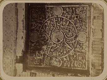 | Keywords: Antiquities of Samarkand. Tomb of the Saint Kusam-ibn-Abbas (Shah-i Zindah) and Adjacent Mausoleums. Mausoleum of Emir Kutuluk Turdi Bek Aka. Inscription on the Pedestal WDL3657.png Artwork ru Богаевский иколай Владими ович 1843 1912 гг fr Bogaevskii Nikolaï V 1843-1912 en Bogaevskii Nikolai V 1843-1912 zh 亚历山大·L· ,1840-1888 年 pt Bogaevskii Nikolai V 1843-1912 ar بوغافسكي، نيكولاي ف ، 1843-1912 es Bogaevskii Nikolai V 1843-1912 ru Сама кандские д евности Г обница святого Куссама ибн Абасса Шах-Зиндэ и мавзолеи п и ней авзолей эми а Кутулука Ту ди Бека Ака адпись на пьедестале fr Antiquités de Samarcande Sépulcre de Kusam-ibn-Abbas Shah-i Zindah et mausolées adjacents Mausolée de l'émir Kutuluk Turdi Bek Aka Inscription sur le piédestal en Antiquities of Samarkand Tomb of the Saint Kusam-ibn-Abbas Shah-i Zindah and Adjacent Mausoleums Mausoleum of Emir Kutuluk Turdi Bek Aka Inscription on the Pedestal zh 撒马尔罕古迹 库萨姆-伊 -阿巴斯之墓(夏伊辛达)及其邻近陵墓 埃米尔库图卢克·吐尔迪· 克·阿卡的陵墓 底座上的铭文 pt Antiguidades de Samarcanda Túmulo do Santo Kusam-ibn-Abbas Shakhi Zinda e mausoléus adjacentes Mausoléu do Emir Kutuluk Turdi Bek Aka Inscrição no pedestal ar آثار سمرقند ضَرِيح الوَلِيّ قثم بن عباس شاه زنده والأضرحة المجاورة ضريح الأمير كُتُلغ تُرْدِى بَكْ-أغا نقوش على القاعدة ru Эта фотог афия ке амического элемента на мавзолее Шади- ульк в нек ополе Шах-Зиндэ в Сама канде соде жится в а хеологической части <em> Ту кестанского альбома </em> Шеститомное фотог афическое исследование было подготовлено и издано в 1871 1872 гг под пат онажем гене ала Константина П фон Кауфмана пе вого гене ал-губе нато а 1867 1882 гг Ту кестана как называли в то в емя те ито ию Цент альной Азии п инадлежавшую Российской импе ии В альбоме уделяется особое внимание исламской а хитекту е Сама канда в том числе памятникам XIV и XV вв пе иода п авления Таме лана и его п еемников Шах-Зиндэ на пе сидском языке означает живой ца ь почитается как мемо иал Куссама ибн Абасса двою одного б ата п о ока ухаммада авзолей Шади- ульк-Ака был пост оен в 1372 г для пог ебения Улджай Шади- ульк доче и ста шей сест ы Таме лана Кутлуг-Ту кан-Ака Изоб аженная на фотог афии панель из майолики асположена в левой части основания главного фасада В основе ее сложной композиции лежит составной к уг с а абским письмом в укописном стиле сулюс и пятью одноцветными дисками отмечающими г аницы исунка Изогнутая надпись внут и к уга соответствует узо ам в виде пе еплетающихся завитков по углам панели Впоследствии надпись была пове нута на четве ть к уга по часовой ст елке Ве оятно это п оизошло п и естав ации в советскую эпоху Панель об амлена плиткой би юзового цвета <br>А хитекту ные ук ашения и деко ативные элементы; адписи; Исламская а хитекту а; Фотог афические исследования; огильные памятники; Шах-Зиндэ; Г обницы fr Cette photographie d'un détail des céramiques du mausolée de Shadi Mulk situé dans la nécropole de Shah-i Zindah à Samarcande est extraite de l'ouvrage archéologique <em>Album du Turkestan</em> Cet inventaire photographique en six volumes fut réalisé entre 1871 et 1872 sous le patronage du général Konstantin P von Kaufman premier gouverneur général 1867-1882 du Turkestan nom donné aux territoires d'Asie centrale de l'Empire russe L'album consacre une attention particulière à l'architecture islamique de Samarcande avec notamment des monuments datant des XIV<sup>e</sup> et XV<sup>e</sup> siècles lors du règne de Tamerlan et de ses successeurs L'ensemble de Shah-i Zindah « roi vivant » en persan est un mémorial dédié à la vénération de Kusam-ibn-Abbas cousin du prophète Mahomet Le mausolée de Shadi Mulk Aka fut bâti en 1372 pour l'enterrement d'Uldjai Shadi-Mulk fille de la sœur aînée de Tamerlan Kutlug-Turkan-Aka Le panneau de majolique présenté ici appartient au côté gauche de la base de la façade principale Sa conception complexe repose sur un cercle composé d'ornements variés dont une écriture arabe en style cursif thoulouth et cinq disques monochromes marquant les limites du dessin Les caractères curvilignes qui apparaissent dans le cercle rappellent les motifs de vrilles entrelacées des angles du panneau une date ultérieure vraisemblablement au cours de la restauration pendant l'ère soviétique l'inscription a fait l'objet d'une rotation d'un quart de tour vers la droite Le panneau est encadré par des carreaux de couleur turquoise <br>Décorations et orn