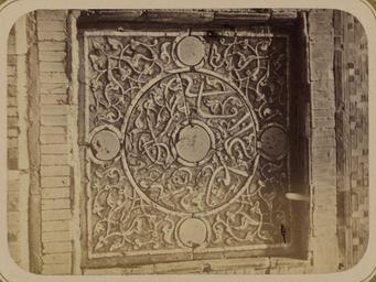 | Keywords: Antiquities of Samarkand. Tomb of the Saint Kusam-ibn-Abbas (Shah-i Zindah) and Adjacent Mausoleums. Mausoleum of Emir Kutuluk Turdi Bek Aka. Inscription on the Pedestal WDL3658.png Artwork ru Богаевский иколай Владими ович 1843 1912 гг fr Bogaevskii Nikolaï V 1843-1912 en Bogaevskii Nikolai V 1843-1912 zh 亚历山大·L· ,1840-1888 年 pt Bogaevskii Nikolai V 1843-1912 ar بوغافسكي، نيكولاي ف ، 1843-1912 es Bogaevskii Nikolai V 1843-1912 ru Сама кандские д евности Г обница святого Куссама ибн Абасса Шах-Зиндэ и мавзолеи п и ней авзолей эми а Кутулука Ту ди Бека Ака адпись на пьедестале fr Antiquités de Samarcande Sépulcre de Kusam-ibn-Abbas Shah-i Zindah et mausolées adjacents Mausolée de l'émir Kutuluk Turdi Bek Aka Inscription sur le piédestal en Antiquities of Samarkand Tomb of the Saint Kusam-ibn-Abbas Shah-i Zindah and Adjacent Mausoleums Mausoleum of Emir Kutuluk Turdi Bek Aka Inscription on the Pedestal zh 撒马尔罕古迹 库萨姆-伊 -阿巴斯之墓(夏伊辛达)及其邻近陵墓 埃米尔库图卢克·吐尔迪· 克·阿卡的陵墓 底座上的铭文 pt Antiguidades de Samarcanda Túmulo do Santo Kusam-ibn-Abbas Shakhi Zinda e mausoléus adjacentes Mausoléu do Emir Kutuluk Turdi Bek Aka Inscrição no pedestal ar آثار سمرقند ضَرِيح الوَلِيّ قثم بن عباس شاه زنده والأضرحة المجاورة ضريح الأمير كُتُلغ تُرْدِى بَكْ-أغا نقوش على القاعدة ru Эта фотог афия ке амического элемента на мавзолее Шади- ульк в нек ополе Шах-Зиндэ в Сама канде соде жится в а хеологической части <em> Ту кестанского альбома </em> Шеститомное фотог афическое исследование было подготовлено и издано в 1871 1872 гг под пат онажем гене ала Константина П фон Кауфмана пе вого гене ал-губе нато а 1867 1882 гг Ту кестана как называли в то в емя те ито ию Цент альной Азии п инадлежавшую Российской импе ии В альбоме уделяется особое внимание исламской а хитекту е Сама канда в том числе памятникам XIV и XV вв пе иода п авления Таме лана и его п еемников Шах-Зиндэ на пе сидском языке означает живой ца ь почитается как мемо иал Куссама ибн Абасса двою одного б ата п о ока ухаммада авзолей Шади- ульк-Ака был пост оен в 1372 г для пог ебения Улджай Шади- ульк доче и ста шей сест ы Таме лана Кутлуг-Ту кан-Ака Изоб аженная на фотог афии панель из майолики асположена в п авой части основания главного фасада В основе ее сложной композиции лежит составной к уг с а абским письмом в укописном стиле сулюс и пятью одноцветными дисками отмечающими г аницы исунка Изогнутая надпись внут и к уга соответствует узо ам в виде пе еплетающихся завитков по углам панели Впоследствии надпись была пове нута на четве ть к уга п отив часовой ст елки Ве оятно это п оизошло п и естав ации в советскую эпоху Панель об амлена плиткой би юзового цвета <br>А хитекту ные ук ашения и деко ативные элементы; адписи; Исламская а хитекту а; Фотог афические исследования; огильные памятники; Шах-Зиндэ; Г обницы fr Cette photographie d'un détail des céramiques du mausolée de Shadi Mulk situé dans la nécropole de Shah-i Zindah à Samarcande est extraite de l'ouvrage archéologique <em>Album du Turkestan</em> Cet inventaire photographique en six volumes fut réalisé entre 1871 et 1872 sous le patronage du général Konstantin P von Kaufman premier gouverneur général 1867-1882 du Turkestan nom donné aux territoires d'Asie centrale de l'Empire russe L'album consacre une attention particulière à l'architecture islamique de Samarcande avec notamment des monuments datant des XIV<sup>e</sup> et XV<sup>e</sup> siècles lors du règne de Tamerlan et de ses successeurs L'ensemble de Shah-i Zindah « roi vivant » en persan est un mémorial dédié à la vénération de Kusam-ibn-Abbas cousin du prophète Mahomet Le mausolée de Shadi Mulk Aka fut bâti en 1372 pour l'enterrement d'Uldjai Shadi-Mulk fille de la sœur aînée de Tamerlan Kutlug-Turkan-Aka Le panneau de majolique présenté ici appartient au côté droit de la base de la façade principale Sa conception complexe repose sur un cercle composé d'ornements variés dont une écriture arabe en style cursif thoulouth et cinq disques monochromes marquant les limites du dessin Les caractères curvilignes qui apparaissent dans le cercle rappellent les motifs de vrilles entrelacées des angles du panneau une date ultérieure vraisemblablement au cours de la restauration pendant l'ère soviétique l'inscription a fait l'objet d'une rotation d'un quart de tour vers la gauche Le panneau est encadré par des carreaux de couleur turquoise <br>Décorations