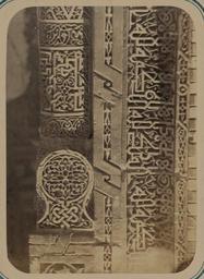 | Keywords: Antiquities of Samarkand. Tomb of the Saint Kusam-ibn-Abbas (Shah-i Zindah) and Adjacent Mausoleums. Mausoleum of Sha Arap. Column Capital WDL3671.png Artwork ru Богаевский иколай Владими ович 1843 1912 гг fr Bogaevskii Nikolaï V 1843-1912 en Bogaevskii Nikolai V 1843-1912 zh 亚历山大·L· ,1840-1888 年 pt Bogaevskii Nikolai V 1843-1912 ar بوغافسكي، نيكولاي ف ، 1843-1912 es Bogaevskii Nikolai V 1843-1912 ru Сама кандские д евности Г обница святого Куссама ибн Абасса Шах-Зиндэ и мавзолеи п и ней авзолей Ша-А ап Капитель колонны fr Antiquités de Samarcande Sépulcre de Kusam-ibn-Abbas Shah-i Zindah et mausolées adjacents Mausolée de Sha Arap Chapiteau de colonne en Antiquities of Samarkand Tomb of the Saint Kusam-ibn-Abbas Shah-i Zindah and Adjacent Mausoleums Mausoleum of Sha Arap Column Capital zh 撒马尔罕古迹 库萨姆-伊 -阿巴斯之墓(夏伊辛达)及其邻近陵墓 沙·阿拉普的陵墓 柱头 pt Antiguidades de Samarcanda Túmulo do Santo Kusam-ibn-Abbas Shah-i Zindah e mausoléus adjacentes Mausoléu de Sha Arap Capitel da coluna ar آثار سمرقند ضَرِيح الوَلِيّ قثم بن عباس شاه زنده والأضرحة المجاورة ضريح شاء آراب تاج العمود ru Эта фотог афия элемента фасада мавзолея Ходжа Ахмада в нек ополе Шах-Зиндэ в Сама канде соде жится в а хеологической части <em> Ту кестанского альбома </em> Шеститомное фотог афическое исследование было подготовлено и издано в 1871 1872 гг под пат онажем гене ала Константина П фон Кауфмана пе вого гене ал-губе нато а 1867 1882 гг Ту кестана как называли в то в емя те ито ию Цент альной Азии п инадлежавшую Российской импе ии В альбоме уделяется особое внимание исламской а хитекту е Сама канда в том числе памятникам XIV и XV вв пе иода п авления Тиму а Таме лана и его п еемников Шах-Зиндэ на пе сидском языке означает живой ца ь почитается как мемо иал Куссама ибн Абасса двою одного б ата п о ока ухаммада П едполагается что мавзолей Ходжа Ахмада был пост оен в 1360-х гг для местного духовного лиде а а этом частично пов ежденном памятнике асположенном в конце п охода в севе ной г уппе г обниц видна я кая многоцветная ке амика с цветочными и геомет ическими узо ами и надписями По бокам а ки фасада или <em>пештака</em> находятся глазу ованные те акотовые колонны со сложными езными геомет ическими узо ами а этом ф агменте с левой сто оны а ки видна ве хняя часть сте жня колонны и ее капитель Как сте жень так и полоса с надписью об амляющая колонну пок ыты изысканными ук ашениями из те акоты адпись состоит из ельефных куфических букв с пе еплетающимися завитками <br>А хеологические объекты; А хитекту ные ук ашения и деко ативные элементы; Исламская а хитекту а; Фотог афические исследования; огильные памятники; Шах-Зиндэ; Г обницы fr Cette photographie d'un détail de façade du mausolée d'Akhmad Khodzha de la nécropole de Shah-i Zindah à Samarcande est extraite de l'ouvrage archéologique <em>Album du Turkestan</em> Cet inventaire photographique en six volumes fut réalisé entre 1871 et 1872 sous le patronage du général Konstantin P von Kaufman premier gouverneur général 1867-1882 du Turkestan nom donné aux territoires d'Asie centrale de l'Empire russe L'album consacre une attention particulière à l'architecture islamique de Samarcande avec notamment des monuments datant des XIV<sup>e</sup> et XV<sup>e</sup> siècles lors du règne de Tamerlan et de ses successeurs L'ensemble de Shah-i Zindah « roi vivant » en persan est un mémorial dédié à la vénération de Kusam-ibn-Abbas cousin du prophète Mahomet Le mausolée d'Akhmad Khodzha fut construit dans les années 1360 vraisemblablement pour un chef spirituel local Situé au bout du passage de la nécropole au nord de l'ensemble des sanctuaires ce monument en partie endommagé présente encore des ornements en céramique polychrome exceptionnels composés de motifs à fleurs géométriques et épigraphiques L'arceau de façade ou <em>peshtak</em> est encadré de colonnes en terre cuite vernissée et sculptée décorées de motifs géométriques complexes Cette vue présente un fragment du côté gauche de l'arceau notamment la partie supérieure du fût de la colonne et son chapiteau Le fût et la bande d'inscription encadrant la colonne contiennent des ornements en terre cuite raffinés L'inscription est composée de caractères coufiques élevés dotés de vrilles entrelacées <br>Sites archéologiques; Décorations et ornements architecturaux; Architecture islamique; Inventaires photographiques; Monuments funéraires; Shāh-i Zindah; Tombes en This photograp