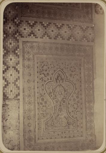 Keywords: Antiquities of Samarkand. Tomb of the Saint Kusam-ibn-Abbas (Shah-i Zindah) and Adjacent Mausoleums. Mausoleum of Emir Abu Tengi. Detail of the Arched-Niche Panel (Bottom) WDL3693.png Artwork ru Богаевский иколай Владими ович 1843 1912 гг fr Bogaevskii Nikolaï V 1843-1912 en Bogaevskii Nikolai V 1843-1912 zh 亚历山大·L· ,1840-1888 年 pt Bogaevskii Nikolai V 1843-1912 ar بوغافسكي، نيكولاي ف ، 1843-1912 es Bogaevskii Nikolai V 1843-1912 ru Сама кандские д евности Г обница святого Куссама ибн Абасса Шах-Зиндэ и мавзолеи п и ней авзолей эми а Абу-Тенги Ф агмент панели а очной ниши нижняя часть fr Antiquités de Samarcande Sépulcre de Kusam-ibn-Abbas Shah-i Zindah et mausolées adjacents Mausolée de l'émir Abu Tengi Détail du panneau de la niche voûtée partie inférieure en Antiquities of Samarkand Tomb of the Saint Kusam-ibn-Abbas Shah-i Zindah and Adjacent Mausoleums Mausoleum of Emir Abu Tengi Detail of the Arched-Niche Panel Bottom zh 撒马尔罕古迹 库萨姆-伊 -阿巴斯之墓(夏伊辛达)及其邻近陵墓 埃米尔·阿布·腾吉的陵墓 拱形壁龛嵌 特写(底部) pt Antiguidades de Samarcanda Túmulo do Santo Kusam-ibn-Abbas Shah-i Zindah e mausoléus adjacentes Mausoléu do Emir Abu Tengi Detalhe do painel do nicho em arco parte inferior ar آثار سمرقند ضَرِيح الوَلِيّ قثم بن عباس شاه زنده والأضرحة المجاورة ضريح الأمير أبو تنجي تفاصيل لوحة المشكاة المقوسة الجزء السفلي ru Эта фотог афия мавзолея Усто Али в нек ополе Шах-Зиндэ в Сама канде соде жится в а хеологической части <em> Ту кестанского альбома </em> Шеститомное фотог афическое исследование было подготовлено и издано в 1871 1872 гг под пат онажем гене ала Константина П  фон Кауфмана пе вого гене ал-губе нато а 1867 1882 гг Ту кестана как называли в то в емя те ито ию Цент альной Азии п инадлежавшую Российской импе ии В альбоме уделяется особое внимание исламской а хитекту е Сама канда в том числе памятникам XIV и XV вв пе иода п авления Таме лана и его п еемников Шах-Зиндэ на пе сидском языке означает живой ца ь почитается как мемо иал Куссама ибн Абасса двою одного б ата п о ока ухаммада Заказчик этого мавзолея пост оенного около 1380 г неизвестен авзолей часто называют по имени главного ст оителя Усто Али есефи Большая часть фасада п ете пела значительные аз ушения однако сох анившиеся остатки ук ашений п едставляют собой одни из самых изысканных деко ативных элементов во всем нек ополе Ке амические ук ашения п едставлены многоцветной плиткой майоликой с геомет ическими узо ами фаянсовыми панелями и полосами с а абскими надписями Эта панель асположенная в нижней части по левой сто оне входной а очной ниши соде жит сложные цветочные узо ы сг уппи ованные вок уг фигу ы в фо ме ост оконечного т илистника с лиственными ка тушами Панель об амлена полосой из восьмиконечных звезд <br>А хитекту ные ук ашения и деко ативные элементы; Исламская а хитекту а; Фотог афические исследования; огильные памятники; Шах-Зиндэ; Г обницы fr Cette photographie du mausolée Usto Ali situé dans la nécropole de Shah-i Zindah à Samarcande est extraite de l'ouvrage archéologique <em>Album du Turkestan</em> Cet inventaire photographique en six volumes fut réalisé entre 1871 et 1872 sous le patronage du général Konstantin P von Kaufman premier gouverneur général 1867-1882 du Turkestan nom donné aux territoires d'Asie centrale de l'Empire russe L'album consacre une attention particulière à l'architecture islamique de Samarcande avec notamment des monuments datant des XIV<sup>e</sup> et XV<sup>e</sup> siècles lors du règne de Tamerlan et de ses successeurs L'ensemble de Shah-i Zindah « roi vivant » en persan est un mémorial dédié à la vénération de Kusam-ibn-Abbas cousin du prophète Mahomet Le commanditaire de ce mausolée construit en 1380 environ étant inconnu ce dernier est souvent appelé par le nom de son maître d'œuvre Usto Ali Nesefi Malgré les dommages considérables sur la majeure partie de la façade les vestiges des ornements révèlent qu'il s'agissait de l'une des décorations les plus sophistiquées de toute la nécropole Les céramiques incluent des carreaux de majolique polychromes formant des motifs géométriques ainsi que des panneaux de faïence et des bandes d'inscription en arabe Ce panneau situé dans la partie inférieure gauche de la niche voûtée de l'entrée est composé de motifs à fleurs sophistiqués disposés autour d'une figure de trèfle pointu avec des cartouches de feuilla