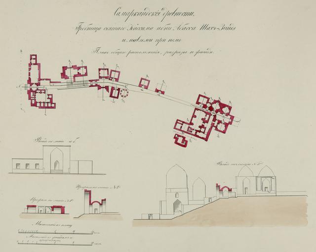 View Original:Antiquities_of_Samarkand._Tomb_of_Saint_Kusam-ibn-Abbas_(Shah-i_Zindah)_and_Adjacent_Mausoleums._Plan_of_the_General_Arrangement_of_Sections_and_Elevations_WDL3899.png (1280x1024)