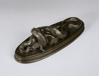 | Keywords: Antoine-Louis Barye - Python Swallowing a Doe (First Version) - Walters 27101 - Three Quarter.jpg An enormous python has coiled itself around a helpless deer and prepares to swallow it Barye became familiar with pythons in 1838 when a reptile house was opened at the Jardin des Plantes Among its first inhabitants were two pythons from Java Indonesia 1840 golden bronze with dark brown patina cm 8 6 30 8 11 4 accession number 27 101 10789 Sichel Sale 1886 William T Walters city Baltimore George A Lucas as agent Henry Walters city Baltimore Walters Art Museum Henry Walters Acquired by William T Walters 1886 Signature Stamped into model and cast through creating raised bridge around letters BARYE 1840; Signature Cold stamped in triplicate BARYE; Number Cold stamped beside stamped signature 2 The Works of Antoine-Louis Barye American Art Gallery New York New York 1889-1890 Untamed The Art of Antoine-Louis Barye The Walters Art Museum Baltimore; Philbrook Museum of Art Tulsa; The Henry Morrison Flagler Museum Palm Beach 2007-2008 place of origin Paris France Walters Art Museum license Sculptures by Antoine-Louis Barye Media contributed by the Walters Art Museum needs category review Sculptures in the Walters Art Museum |