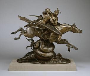 | Keywords: Antoine-Louis Barye - Roger and Angelica Mounted on the Hippogriff - Walters 27173 - Profile.jpg This subject is taken from Orlando Furioso an epic poem set in the 9th century written by Ludovico Ariosto in 1516 Roger a knight at the court of King Charlemagne has rescued the princess of Cathay who had been chained to a rock on the Isle of Tears and was about to be devoured by a sea monster The knight carries her across the seas on his hippogriff a creature part horse and part eagle They are supported above the waves by an immense dolphin Emerging from the sea froth is a large octopus While in flight Roger falls passionately in love with the princess but when they land she escapes from him using a magical ring while he struggles to undo his armor modeled ca 1840; first cast 1846 bronze cast in several sections connected with rivets and bolts with brown patina over golden bronze cm 51 75 58 74 accession number 27 173 28393 Hector Brame William T Walters Baltimore April 24 1884 by purchase commissioned by George A Lucas for William T Walters maybe called no 6 Angélique et Roger montés sur l'Hippogriffe Henry Walters city Baltimore Walters Art Museum Henry Walters Acquired by William T Walters Signature Cast through from model BARYE The Works of Antoine-Louis Barye American Art Gallery New York New York 1889-1890 Flight Fantasy Faith Fact Dayton Art Institute Dayton 1953-1954 Parallels and Precedents Baltimore's George A Lucas Collection Baltimore Museum of Art Baltimore 1995 Untamed The Art of Antoine-Louis Barye The Walters Art Museum Baltimore; Philbrook Museum of Art Tulsa; The Henry Morrison Flagler Museum Palm Beach 2007-2008 place of origin Paris France Walters Art Museum license Roger and Angelica Mounted on the Hippogriff Sculptures in the Walters Art Museum |