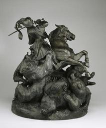 | Keywords: Antoine-Louis Barye - "Surtout de table" - Bear Hunt - Walters 27183 - Profile.jpg This sculpture of a 16th-century German hunt was placed next to the Wild Bull Hunt Walters 27 178 near one end of the centerpiece Two hunters one on foot and the other mounted on a rearing horse are accompanied by mastiffs as they attack the bears The firm of Richard et Fressange was originally assigned to cast this sculpture but as with the Elk Hunt it was sent to Honoré Gonon who completed it using the lost-wax method between 1834 1838 bronze lost-wax and sand cast with warm warm brown/black patina over areas of metallic flake or powdered surface cm 47 6 43 2 accession number 27 183 5498 Duc d'Orléans 1844 by commission duchesse d'Orleans date of acquisition unknown by inheritance duchesse d'Orleans Sale Paris January 18-20 1853 no 1 Count Anatole Demidoff date and mode of acquisition unknown San Donato Sale Paris March 22-24 1870 no 1535 William Tilden Blodgett New York date and mode of acquisition unknown William T Walters Baltimore April 27 1876 Henry Walters city Baltimore Walters Art Museum 1931 by bequest Acquired by William T Walters 1876 Signature and Date BARYE / 1838; Transcription Inscribed FONDU A L'HOTEL D'ANGEVILLIERS / PAR HONORE GONON ET SES DEUX FILS; Translation Inscribed Cast at the Hotel D'Angevilliers / By Honoré Gonon and his two sons; Number Painted inside in white W / 46 Untamed The Art of Antoine-Louis Barye The Walters Art Museum Baltimore; Philbrook Museum of Art Tulsa; The Henry Morrison Flagler Museum Palm Beach 2007-2008 The Works of Antoine-Louis Barye American Art Gallery New York New York 1889-1890 Un âge d'or des arts décoratifs 1814-1848 Galeries nationales du Grand Palais Paris 1991 Highlights from the Collection The Walters Art Gallery Baltimore 1998-2001 place of origin Paris France Walters Art Museum license Sculptures by Antoine-Louis Barye Media contributed by the Walters Art Museum needs category review Sculptures in the Walters Art Museum House of Demidov's collections |