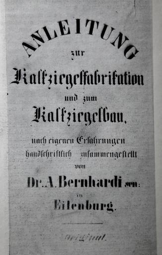 | Keywords: Anton Bernhardi Patentschrift Titelblatt.jpg Anleitung Dr Anton Bernhardis zur Kalkziegelfabrikation Die Archive des Kreises Eilenburg Hrsg Arbeitsgemeinschaft der Archivare des Kreises Eilenburg o J vor 1990 um 1856 Anton Bernhardi 1813-1889 Anton Bernhardi PD-old |