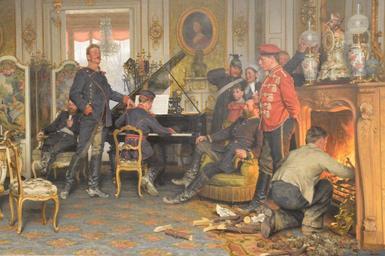| Keywords: Anton von Werner - A Billet outside Paris (1894) 2.JPG en Anton von Werner's 1894 painting Im Etappenquartier vor Paris A Billet outside Paris at the Alte Nationalgalerie Berlin The painting depicts German troops occupying the Château de Brunoy outside Paris on October 24 1870 during the Franco-Prussian War 2014-12-18 16 21 50 own Illustratedjc other versions PD-old-80 PD-1923 cc-by-sa-4 0 Paintings in the Alte Nationalgalerie Paintings of Franco-Prussian War 1894 paintings in Germany Anton von Werner Siege of Paris 1870-1871 Interiors of castles in France Fireplaces in art German soldiers in art Buildings in Brunoy Castles in Essonne France in history paintings 19th-century military life in painting Paintings by Anton von Werner October 1870 in France Uploaded with UploadWizard |