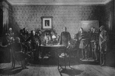 | Keywords: Anton von Werner, Kapitulations-Verhandlungen von Sedan (19. Jhdt., Schwarz-Weiß-Version).png author after Die deutsch-französischen Kapitulationsverhandlungen am 2 September 1870 Deutscher Verhandlungsführer ist Otto Graf von Bismarck 1815 “1898 A depiction of the talks in the village of w Donchery Ardennes department Ardennes France on 1870 09 02 hours after the French Army of Châlons had run up a white flag over Sedan Ardennes Sedan Members of the French delegation pictured on the left Supreme Commander Emmanuel Félix de Wimpffen just standing up General Auguste-Alexandre Ducrot and other officers Members of the delegation from the Prussian Coalition pictured on the right Supreme Commander Helmuth von Moltke the Elder standing at the table Otto von Bismarck sitting to Moltke's left Field Marshall Germany General Field Marshall Leonhard Graf von Blumenthal General Field Marshall Alexander August Wilhelm von Pape commanders of the 3rd- and the Maas-Army and other officers after 1870-09-02 oil canvas accession number object history credit line Cite book Theodor H Lindner Der krieg gegen Frankreich und die einigung Deutschlands Zur 25 jährigen wiederkehr der gedenktage von 1870/1871 Berlin A Asher Co 1895 23801082 other versions 100x100px Anton von Werner Kapitulations-Verhandlungen von Sedan 19 Jhdt jpg PD-old Paintings by Anton von Werner Auguste-Alexandre Ducrot Napoléon III surrenders 1870 Helmuth von Moltke the Elder Light in art Shadows in art |