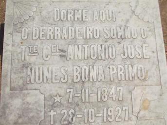 | Keywords: Antonio José Nunes Bona Primo de CM.JPG Imagem da lápide do túmulo de Antonio José Nunes Bona Primo Um político militar e fazendeiro que denomina a Prça Bona Primo em Campo Maior-Piauí trabalho próprio own work 2014 seu nome ou assinatura Academia de letras de CM <span class signature-talk ></span> Campo Maior Piauí |