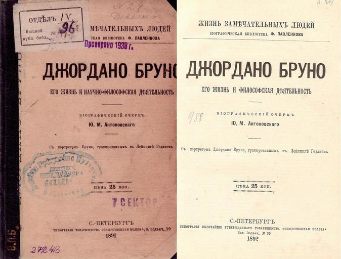 Keywords: Antonovsky Giordano Bruno 1891.jpg en Cover and title page J Antonovsky Giordano Bruno SPb F Pavlenkov ed 1891 ru Обложка и титульный лист Антоновский Ю Джо дано Б уно СПб Издательство Ф Павленкова 1891 http //www herzenlib ru/pavlenkov/main/ Ки овский филиал сод ужества павленковских библиотек Юнеско Serge Lachinov 2011 PD-old Giordano Bruno