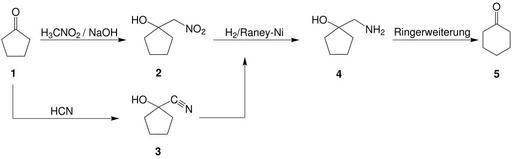 Keywords: Anwendungsbeispiel Tiff-Seite001.svg en Example of the Tiffeneau Ring Expansion with two different solvents de Beispiel für Tiffeneau-Ringerweiterung mit zwei verschiedenen Lösungsmitteln own бе еста 06 01 14 Organic reactions Cc-zero