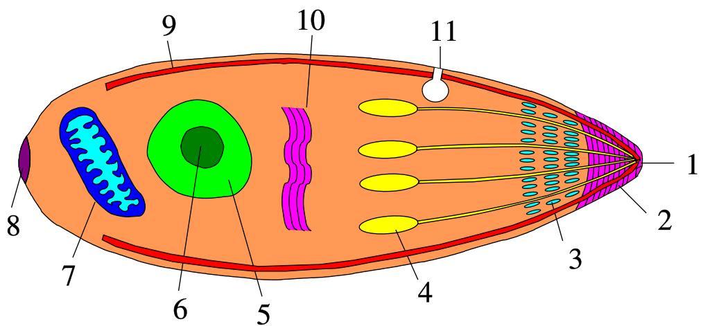 | Keywords: Apicomplexa structure.svg Apicomplexan structure 1-polar ring 2-conoid 3-micronemes 4-rhoptries 5-nucleus 6-nucleolus 7-mitochondria 8-posterior ring 9-suppedicular microtubules 10-golgi apparatus 11-micropore Ст укту а спо овика 1-поля ное кольцо 2-коноид 3-мик онемы 4- опт ии 5-клеточное яд о 6-яд ышко 7-митохонд ия 8-заднее кольцо 9-альвеолы 10-аппа ат Гольджи 11-мик опо а self-made with http //www xfig org xfig in Linux 2007-08-31 Franciscosp2 Apicomplexa Diagrams labelled with numbers only Cell nucleolus |