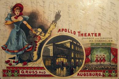 | Keywords: Apollo Theater Gruss aus Augsburg.jpg Ansichtskarte Apollo-Theater Inhaber und Director Ad Chandelier “ Gruss aus Augsburg ; Kunstanstalt und Druckereien Kaufbeuren; gelaufen 1902 http //www ebay de before 1902 anonymous Anonymous-EU PD-1923 Images from eBay Theaters in Augsburg Postcards of Augsburg |