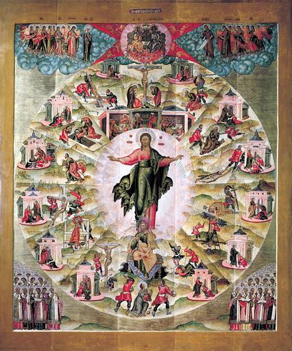 | Keywords: ApostleFedorZubov.jpg  ru «Апостольская п оповедь» - сложная многофигу ная иконог афическая композиция имеющая в цент е  остовую фигу у Х иста ок уженную в секто ах к уга сценами п извания служения и кончины апостолов Икона из Я ославского музея-заповедника en Ministry of the Apostles a complex multi-figure icon with a full-height image of Jesus Christ surrounded by sectors with scenes of His disciples' calling ministry and martyrdom Icon from the Yaroslavl Museum Preserve http //nesusvet narod ru/ico/icons/u_011 htm Fyodor Zubov / Фёдо Зубов  1689 1660 PD-old-100 Fyodor Zubov Icons of apostles Jesus and apostles 1660 paintings from Russia Christ icons Passion of Apostles |