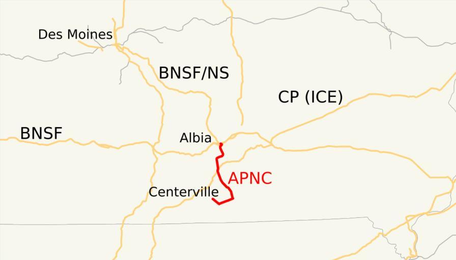 Keywords: Appanoose County Community Railroad system map.svg This is a map of the Appanoose County Community Railroad as of 2009 with other railroads in gray Class I railroads in orange Email me if you would like a copy of the GIS data I created modified from Bureau of Transportation Statistics North American Transportation Atlas Data or if you see any errors 2009-04-01 own assumed NE2 System maps of U S railroads Appanoose County Community Railroad |