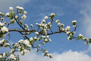 Keywords: apple tree blossom branch spring sky blue white
