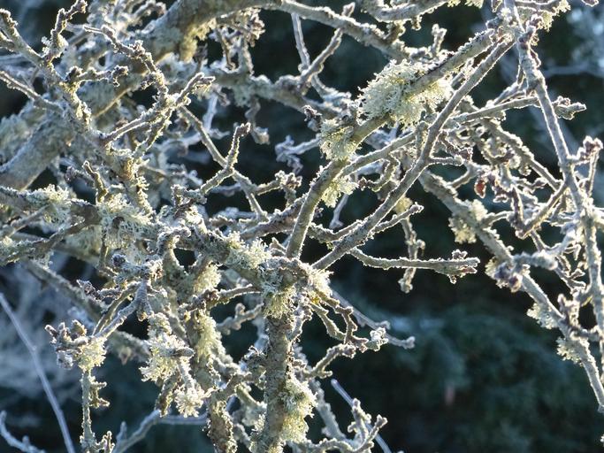 Keywords: apple tree branches winter moss background rime