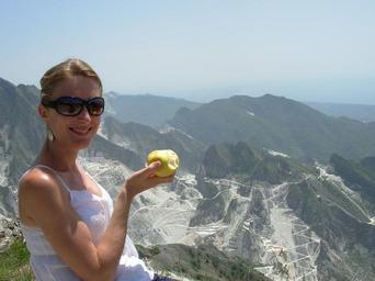 Keywords: apple woman marble carrara smile mountains quarry sunglasses nature panorama people white