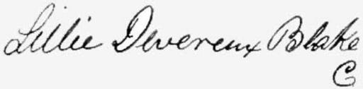 | Keywords: Appletons' Blake Lillie Devereux signature.jpg en Signature of 19th-century reformer Lillie Devereux Blake Appletons' Cyclopædia of American Biography 1900 v 1 p 285 Lillie Devereux Blake published 1900 pd-old Lillie Devereux Blake Signatures of people from the United States |