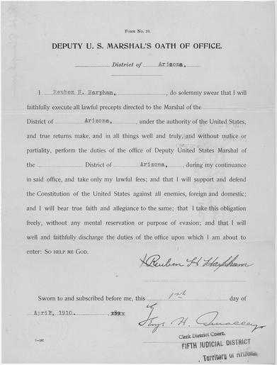 | Keywords: Appointment and Oath of Office for Rueben H. Harpham as Deputy Marshal in the Territory of Arizona. - NARA - 295738.tif Scope and content General notes 295738 Local identifier NARA's Pacific Region Riverside NRHAR 23123 Cajalco Rd Perris CA 92570 1910-04-01 Record group Record Group 527 Records of the U S Marshals Service 1864 - 1992 Record group ARC 764 Appointments and Oaths of U S Marshals and Deputy Marshals compiled 1864 - 1912 Series ARC 295651 File unit File unit ARC Variant control numbers NAIL Control Number NRHL-527-AZ1-87 yes Other versions NARA-cooperation PD-USGov Check categories-NARA 2011 September 13 Documents in English |