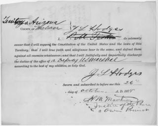 | Keywords: Appointment and Oath of Office for J. L. Hodges as Deputy Marshal in the Territory of Arizona. - NARA - 295755.tif Scope and content General notes 295755 Local identifier NARA's Pacific Region Riverside NRHAR 23123 Cajalco Rd Perris CA 92570 1878-10-26 Record group Record Group 527 Records of the U S Marshals Service 1864 - 1992 Record group ARC 764 Appointments and Oaths of U S Marshals and Deputy Marshals compiled 1864 - 1912 Series ARC 295651 File unit File unit ARC Variant control numbers NAIL Control Number NRHL-527-AZ1-104 yes Other versions NARA-cooperation PD-USGov Check categories-NARA 2011 September 13 Documents in English |
