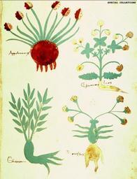 | Keywords: Appolinaris. Chamomeleon. Sliatriceo. Narcissus.jpg en Four plants Plant top l Appolinaris many linear leaves and flowering stems radiate from the upper part of a spherical bulb each flower multi-lobed and laterally symmetrical pink on the l white on the r side green with red root Plant top r Chamomeleon perhaps family Compositae Carduus Tribe Atractylis cancellata Pine Thistle three compound inflorescences branching from a vertical stem bearing pointed leaves and flowers with two large leaves at base green with yellow roots and yellow flowers Plant bottom l Sliatriceo three straight radiating stems bearing alternate lancelate leaves growing from thick root green Plant bottom r Narcissus family Amaryllidaceae sometimes combined with Liliaceae Narcissus sp two radiating stems with three yellow flowers at tip growing from a strange vase-shaped stem with three linear leaves extending horizontally from each side green with brown root Adjacent text Italian herbal http //digital2 library ucla edu/viewItem do ark 21198/zz0000zw4h Unknown artist from Italy ~ 1500 PD-art 16th-century illuminated manuscripts Herbal manuscripts Files uploaded by PDTillman |