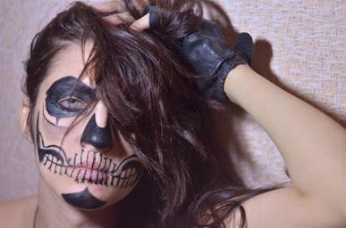 Keywords: aqua make-up photoshoot girl skull drawing on the face portrait