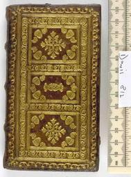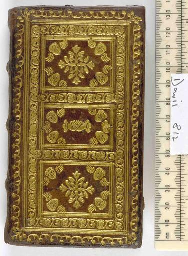 | Keywords: Arcadia -and- Le Rime - Upper cover (Davis812).jpg Style Cherubs head Hand motif; Caption Upper cover; Colour Brown; Edge Gilt gauffered exhibition history Decorative Technique Tooled in gold; Cover Material Goatskin includes morocco turkey etc Macchi states; Venetian style c1553 Bought at Librairie ancienne Ulrico Hoepli Milan Bibliothèque Joseph Martini deuxième partie p 82 n 176 object history Text 1553; Venice; Unspecified object type Cc-zero place of creation Binding Italy place of discovery M M Foot The Henry Davis Gift Vol III London 2010 British Library image http //www bl uk/catalogues/bookbindings/LargeImage aspx RecordId 020-000004988 ImageId ImageId 42099 Copyright BL Arcadia and Le Rime Uploaded with GWToolset Arcadia and Le Rime - Upper cover Davis812 http //www webarchive org uk/bldatasets/bindings/6676_4 jpg Gilded books 16th-century bookbinding British Library Bookbindings |