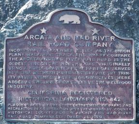 | Keywords: ArcataAndMadRiverPlaque.jpg en California Registered Historical Landmark No 842 w Arcata and Mad River Railroad Plaque reads Arcata and Mad River Rail Road Company - Incorporated December 15 1854 as the Union Plank Walk Rail Track and Wharf Company the Arcata and Mad River Rail Road is the oldest line on the North Coast Originally using a horse-drawn car the railroad served as a link between Humboldt Bay and the Trinity River mines Later Locomotives were added as the line grew to serve the redwood industry California Registered Historical Landmark No 842 Plaque placed by the State Department of Parks and Recreation in cooperation with the Humboldt County Historical Society and the Arcata and Mad River Rail Road Company September 26 1970 842 original photo Ellin Beltz 2012-03-10 40 52 53 49 N 123 59 27 26 W region US California Historical Landmarks in Humboldt County California Blue Lake California Historical markers in Humboldt County California Taken with Panasonic Lumix DMC-FX12 California Historical Landmarks plaques Photographs by Ellin Beltz |