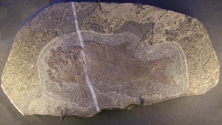 Keywords: Archaeosemionotus sp.jpg en Fossil of Archaeosemionotus sp from the Ladinian Middle Triassic Cassina beds Meride Limestone Formation of the Monte San Giorgio Ticino Switzerland Collection of the museum of natural history Museo cantonale di storia naturale http //www ti ch/dt/da/museo/temi/ of Lugano Stone slab is about 40 cm in width own Woudloper 2008-11 Archaeosemionotus Triassic fossils Monte San Giorgio Semionotiformes fossils
