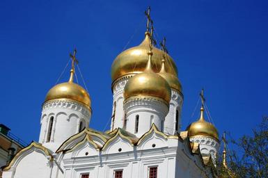Keywords: archeology church building white religion russian orthodox towers golden onion domes arched features blue sky shiny light russian crosses
