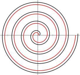 | Keywords: Archimedean-involute-circle-spirals-comparison.svg Comparison of the Archimedean spiral generated by the equations <tt>x θcosθ</tt> and <tt>y θsinθ</tt> with the Involute of a circle generated by the equations <tt>x cosθ+θsinθ</tt> and <tt>y sinθ-θcosθ</tt> where θ is an angle expressed in radians The Archimedean spiral is shown in red and corresponds to the values <tt>0 ‰¤ θ ‰¤ 8Ï </tt> of the angle parameter while the Involute of the circle is shown in black and corresponds to the values <tt>0 ‰¤ θ ‰¤ 17Ï /2</tt> of the angle parameter The x-axis extends from -25 to +28 and the y-axis from -26 4 to +23 4 and there are tick marks at -20 -10 +10 +20 along the axes The curves are 1 unit apart at their start points while they are slightly more than 1 5 and slightly less than Ï /2 units apart where they intersect the x-axis for the final time in this plot Self-made graphic converted from the following vector PostScript source code <pre> 300 396 translate 10 dup scale 6 setgray 3 setlinewidth -25 0 moveto 28 0 lineto stroke 0 -26 4 moveto 0 23 4 lineto stroke 0 setgray/radians 57 2957795131 def/q 2 div/x exch def/c x cos def/s x sin def/x x radians div def def 1 setlinejoin 1 0 moveto 1 1 3060 q c x s mul add s x c mul sub lineto for stroke 1 0 0 setrgbcolor 0 0 moveto 1 1 2880 q x c mul x s mul lineto for stroke showpage EOF</pre> 2012 AnonMoos Archimedean spirals Involute Images with PostScript source code Spirals |