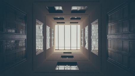 Keywords: architecture building contemporary design development hallway indoor interior level looking modern multi office skylight storey up