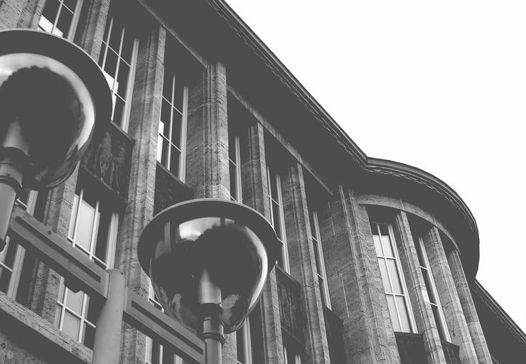 Keywords: architecture building facade front windows house exterior big representative brick lanterns black and white