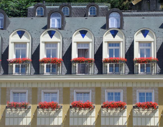 Keywords: architecture facade balconies flowers hotel windows repetition symmetry summers
