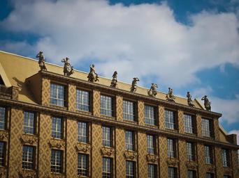 Keywords: architecture figures statue sculpture building facade architectural detail stone figure düsseldorf modern housewife stone figures city