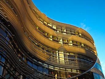 Keywords: architecture modern building skyscraper abstract facade düsseldorf city perspective sunset evening