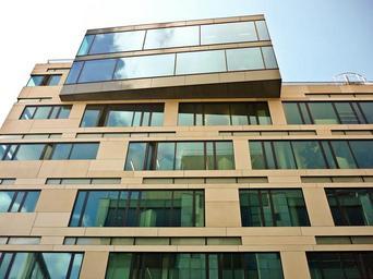 Keywords: architecture modern building skyscraper facade glass office building low angle shot düsseldorf