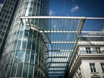 Keywords: architecture modern building skyscraper facade glass bluish office building low angle shot düsseldorf glass roof