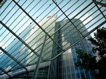 Keywords: architecture modern building skyscraper facade glass bluish office building low angle shot düsseldorf glass roof