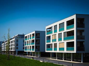 Keywords: architecture modern building facade homes colorful houses facades live düsseldorf city