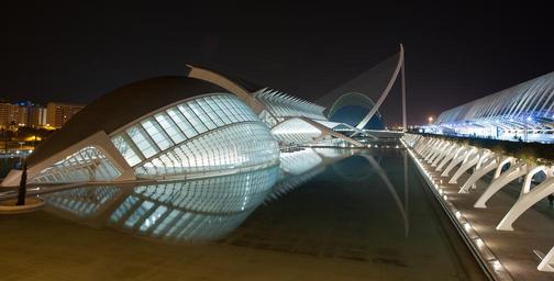 Keywords: architecture santiago calatrava reflection water pond city tourism spain valencia city of the arts valence building light night
