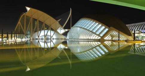 Keywords: architecture santiago calatrava reflection water pond city tourism spain valencia city of the arts valence building light night