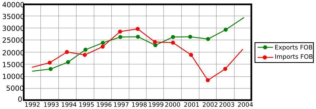 | Keywords: Argentina trade chart.svg en A chart showing the amount of exports and imports of Argentina from 1992 to 2004 Note the slight trade surplus in 1995 and 1996 with trade deficit elsewhere until the recession and the Argentine economic crisis of 2001 followed by currency devaluation produced a sharp drop in imports I Premeditated Chaos re-drew this chart as an SVG from the original chart created by the wikipedian Pablo D Flores en User Pablo-flores which uses statistical data from the http //www indec gov ar INDEC The author released his original into the public domain and I release this SVG version into public domain as well or any similarly rights-free license 2012-01-28 File Argentina trade chart png Premeditated Chaos cc-zero Check categories 2012 January 29 en wikipedia Foreign_trade_of_Argentina 5 Economy of Argentina Uploaded with UploadWizard International trade International relations of Argentina Government of Argentina |